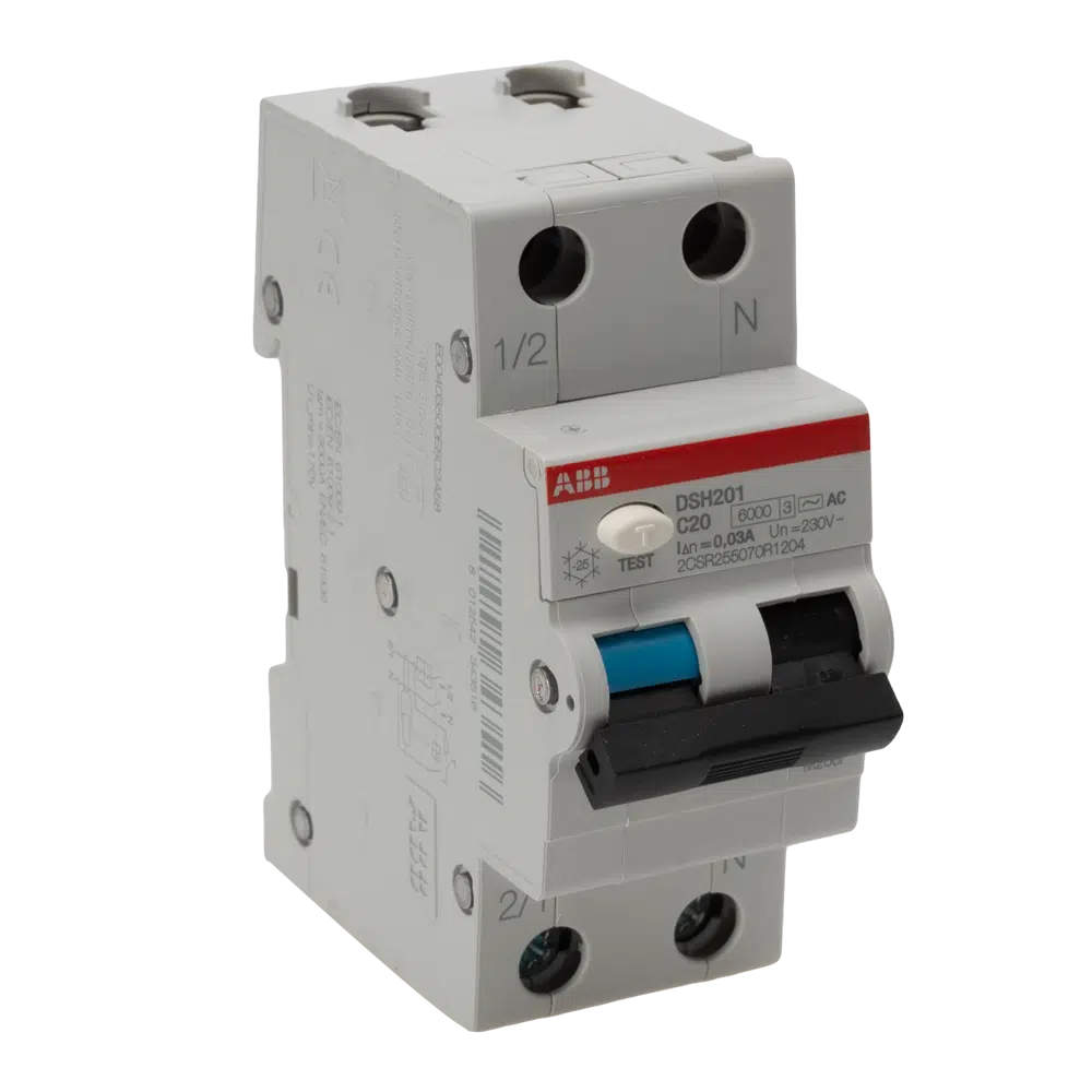 Siguranță diferențială ABB 1P+N 20A 6kA 30mA cu curba de declanșare C, ideală pentru protecția circuitelor monofazate.
