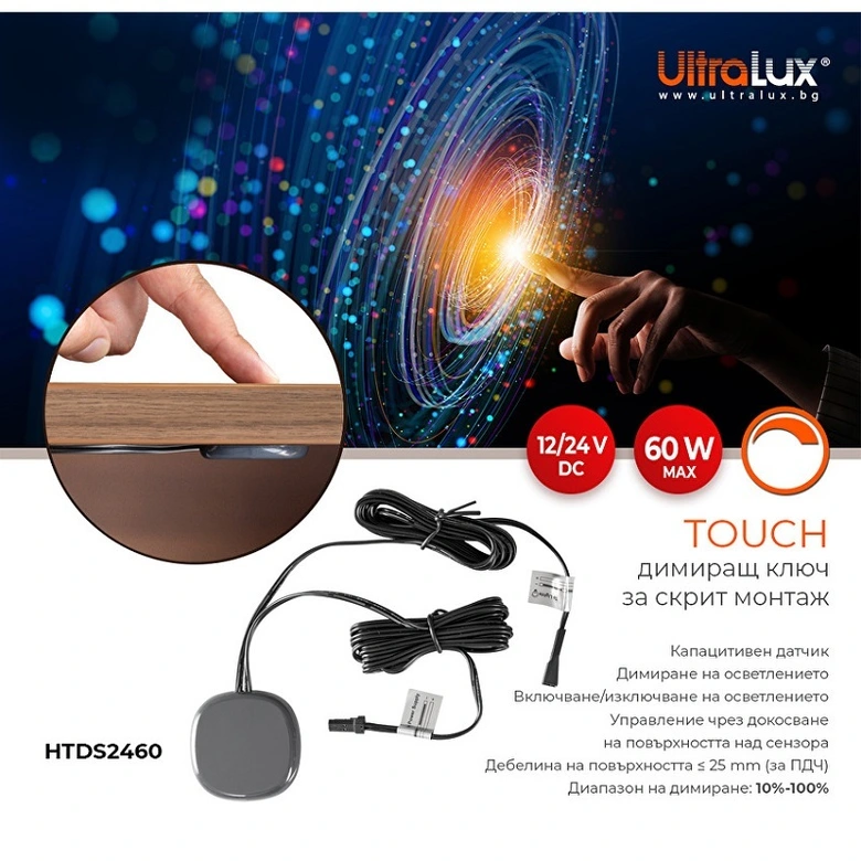 Intrerupator ascuns TOUCH pentru controlul pornirii, opririi si reglajului luminozitatii iluminarii LED, compatibil cu tensiuni de 12/24V DC si o putere maxima de 60W.