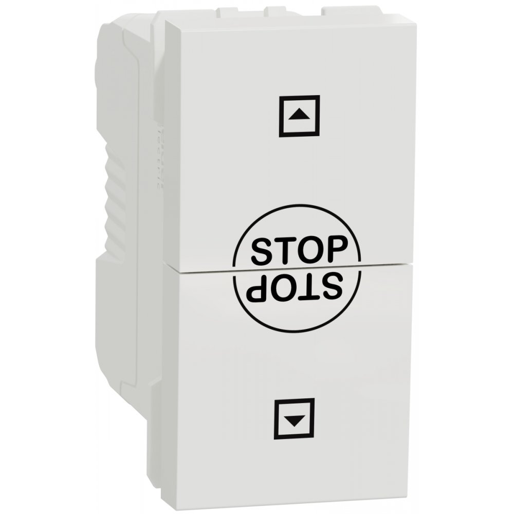 Întrerupător modular pentru jaluzele, 1 modul, 10A, alb, cu simboluri SUS-JOS-STOP pentru control intuitiv.