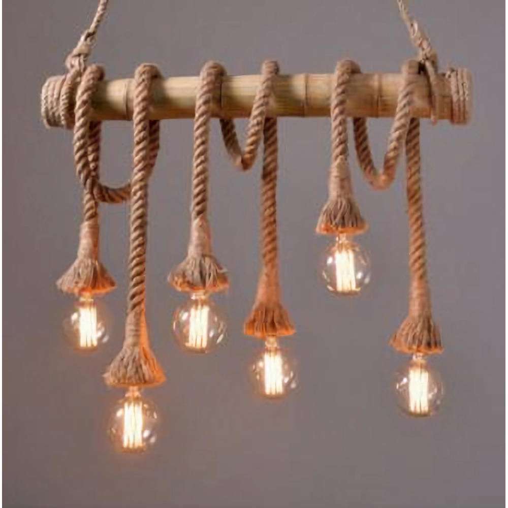 Lustră rustică cu 6 socluri E27, design vintage, fabricată din metal și frânghie de cânepă, ideală pentru diverse spații interioare.