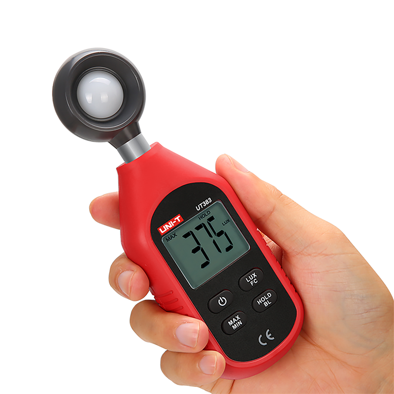 Luxmetru digital UT383 UNI-T pentru măsurarea precisă a intensității luminii, cu interval de 0-199.999 Lux și funcții suplimentare utile.