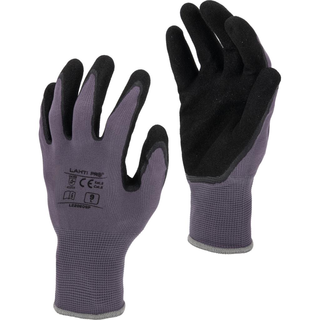 Mănuși de protecție LAHTI PRO L220608K, mărimea 8, negre și gri, cu înveliș de nitril pentru rezistență sporită la grăsimi și uleiuri.