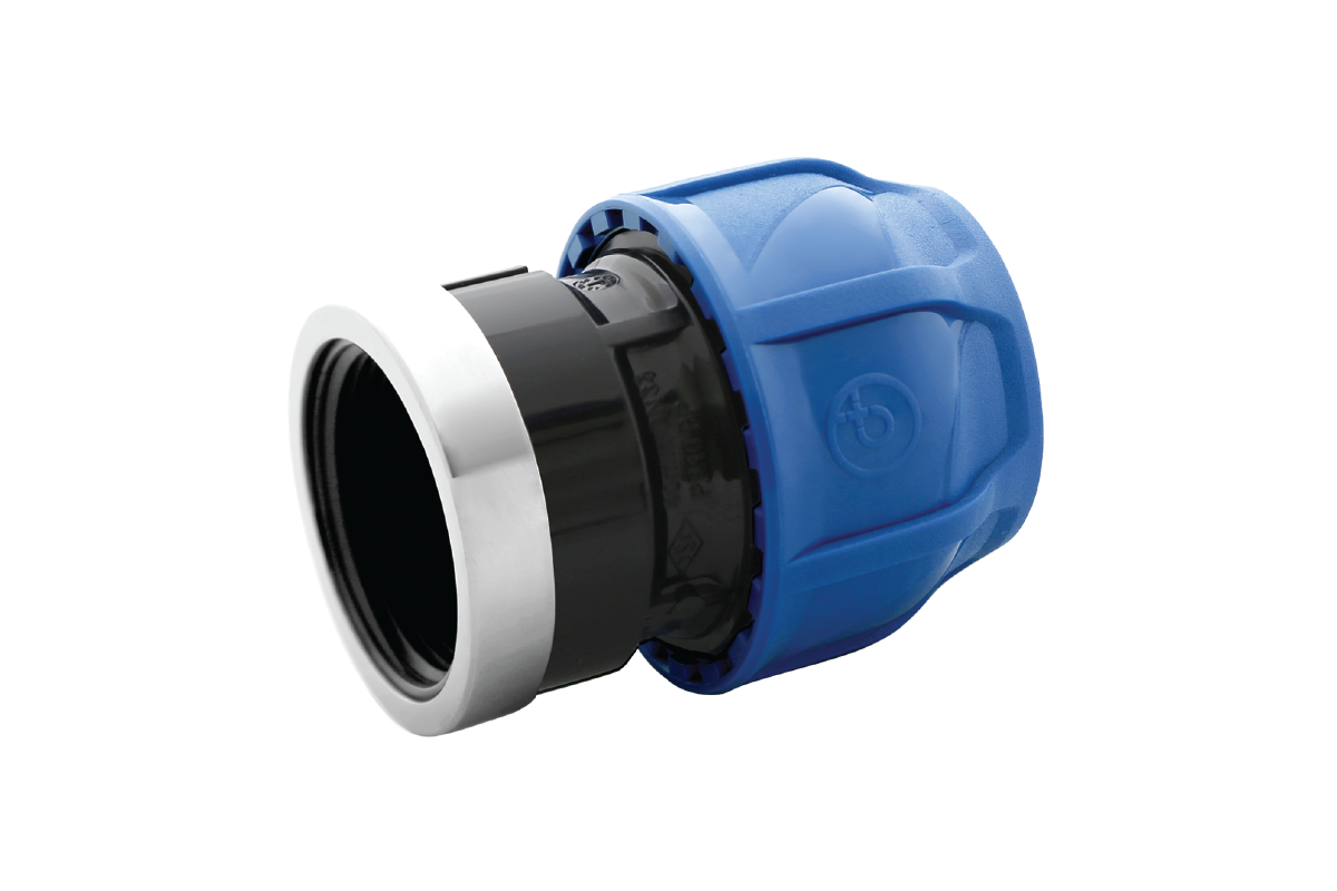 Mufă de compresiune mixtă cu filet interior, fabricată din polipropilenă de înaltă calitate, rezistentă la impact și raze UV, compatibilă cu conducte PE și PEX, presiune maximă PN16.