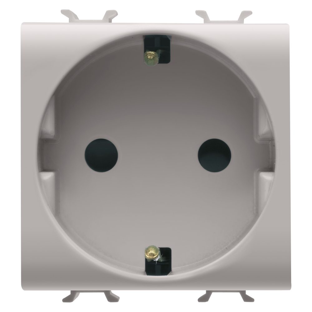 Priza Schuko modulară Gewiss Chorus, 2 module, 16A, 2P+E, culoare bej satinat natural, cu protecție pentru copii și borne cu șuruburi, conform standardelor IEC 60884-1, DIN VDE 0620-1 și UNE 20315-1-1.