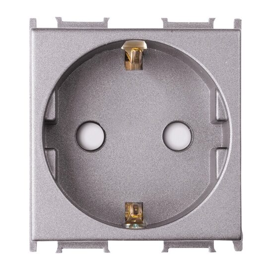 Priza Schuko 2P+E cu obturator pentru protecție copii, dimensiune 2M, curent nominal 16AX, tensiune 250V. Concepută pentru siguranță sporită în spațiile rezidențiale, prevenind accesul accidental la contactele electrice. Compatibilă cu aparataj modular, fabricată din materiale durabile, asigurând fiabilitate și protecție.