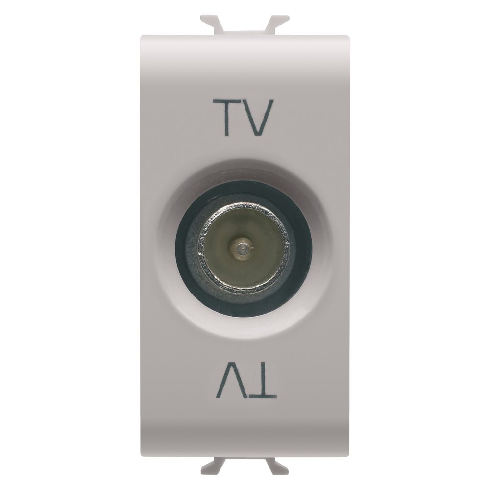 Priza TV directă Gewiss Chorus Monochrome, 1 modul, culoare bej, conector tată IEC 9,5 mm, atenuare 0 dB, frecvență 5-2400 MHz, ecranare Clasa A, material carcasă din zamak turnat sub presiune, material tehnopolimer.