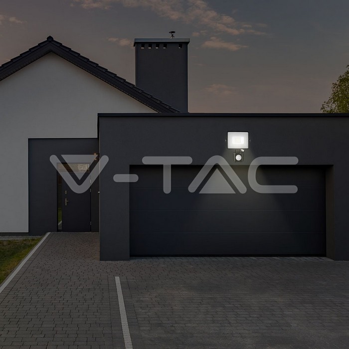 Proiector LED V-TAC 20W cu senzor de mișcare, lumină rece 6400K, IP65, cablu 1m, negru.