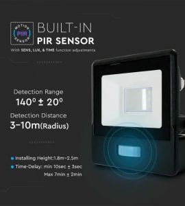 Senzorul mixt de prezență și crepuscular detectează mișcarea pe o rază de 140° și la o distanță reglabilă între 3 și 10 metri. Timpul de funcționare poate fi setat între 10 secunde și 7 minute, iar înălțimea recomandată pentru instalare este între 1,8 și 2,5 metri. Acest proiector este ideal pentru iluminarea căilor de acces, intrărilor și altor zone unde utilizarea întrerupătoarelor este dificilă.