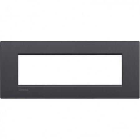 Rama de acoperire de 7 module antracit LivingLight de la BTicino, realizată din tehnopolimer fără halogeni, cu finisaj mat, pentru montaj orizontal încastrat.
