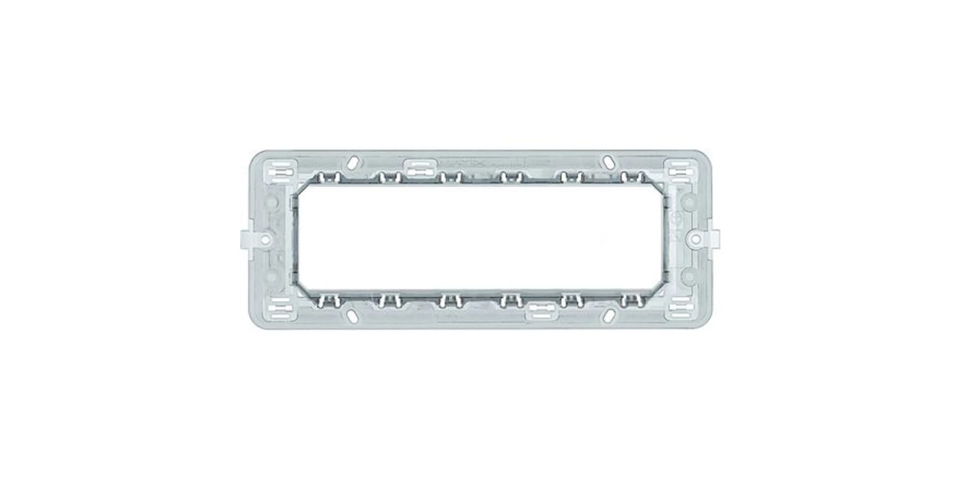 Placa suport modulară cu 6 module din gama Matix de la Bticino, destinată montajului încastrat pe suprafețe de gips-carton sau zidărie. Fabricată din plastic termoplastic de înaltă calitate, fără halogeni, asigură o instalare ușoară și o integrare estetică în orice interior.