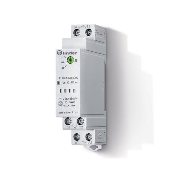 Releul crepuscular modular Finder 11.31.8.230.0000 este proiectat pentru controlul automat al iluminatului în funcție de nivelul intensității luminoase ambientale, având o celulă fotoelectrică separată de corpul releului.