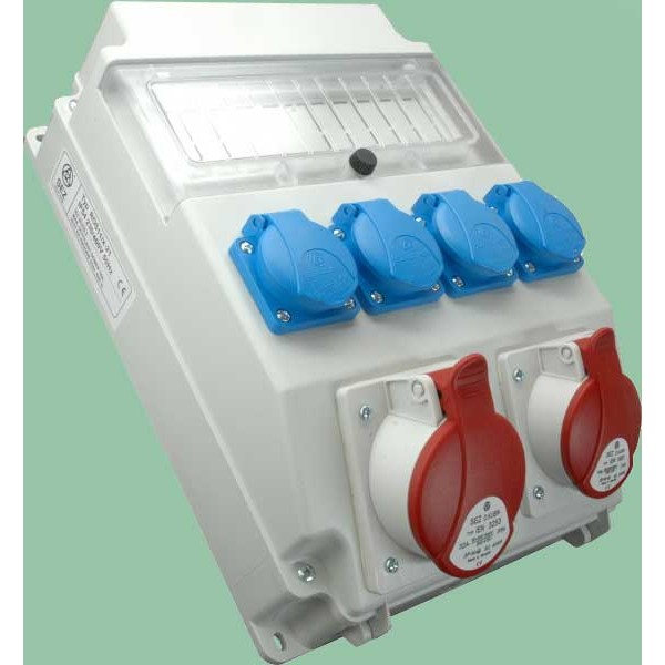 Panou de distribuție ROS 11*22S cu 2 prize 5x32A 400V și 4 prize SCHUKO 16A 250V, protecție IP54.