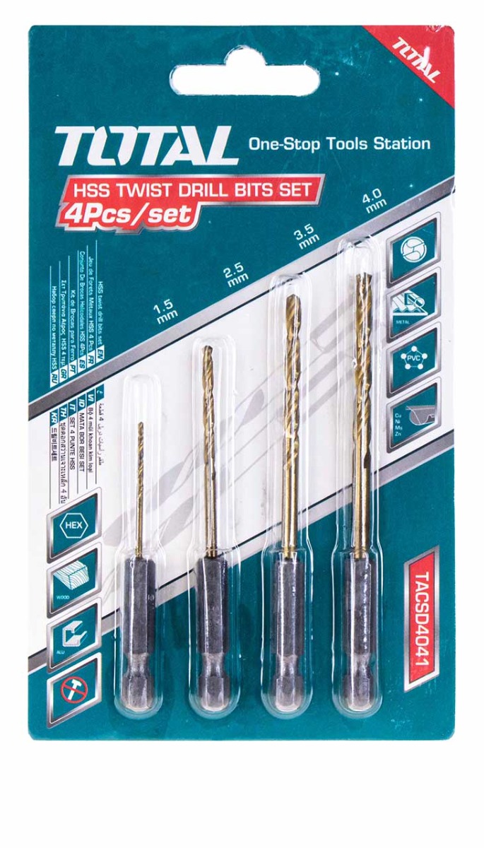 Set de 4 burghie HSS TOTAL cu prindere hexagonală de 1/4", dimensiuni 1.5-4.0 mm, fabricate din oțel M2 HSS.