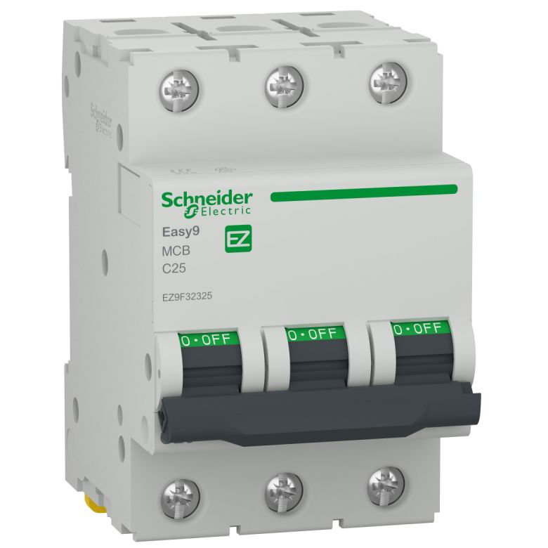 Siguranță automată trifazată Schneider Electric Easy9 25A, curbă C, 6kA, pentru protecția eficientă a instalațiilor electrice rezidențiale și comerciale mici.