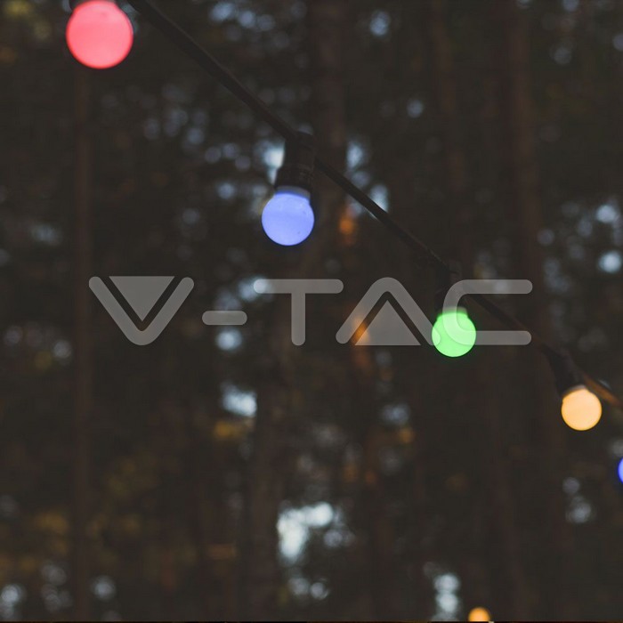 Acest șir de iluminat festiv este ideal pentru decorarea spațiilor interioare și exterioare, oferind o atmosferă plăcută și colorată. Dispune de 20 de becuri LED colorate (3 roșii, 3 verzi, 3 albastre, 5 alb cald, 3 galbene și 3 roz) cu soclu E27, amplasate la o distanță de 50 cm între ele. Conectorii de intrare și ieșire permit conectarea mai multor șiruri de lumină, iar cablul plat 2x1,5mm² H05RNH2-F asigură durabilitate și siguranță. Gradul de protecție IP44 permite utilizarea în condiții exterioare.