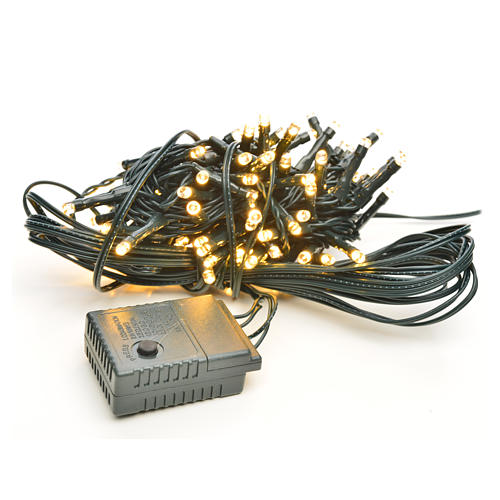 Șir luminos cu 100 LED-uri alb cald intermitente, 230V, interconectabil până la 3 seturi, cablu verde din cauciuc, IP65, ideal pentru decorațiuni exterioare festive.