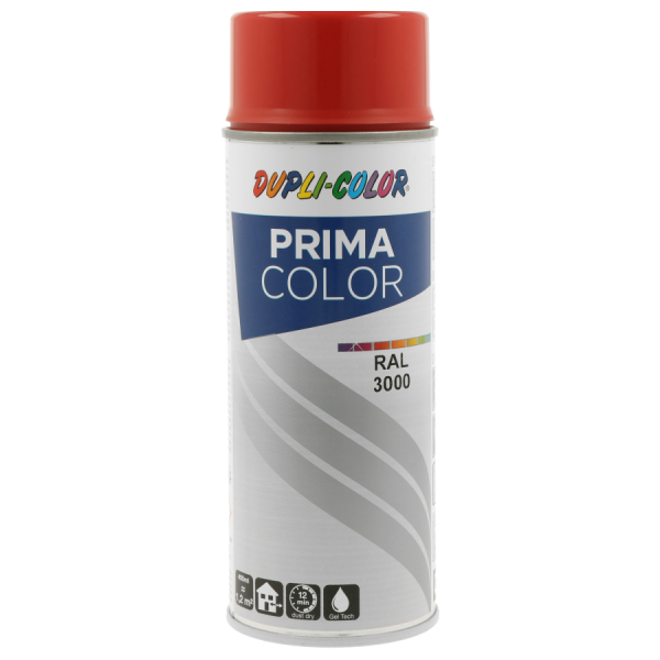 Vopsea spray acrilică Dupli-Color Prima RAL 3000 Roșu Foc, 400 ml, pentru utilizare universală, cu uscare rapidă și rezistență la intemperii.