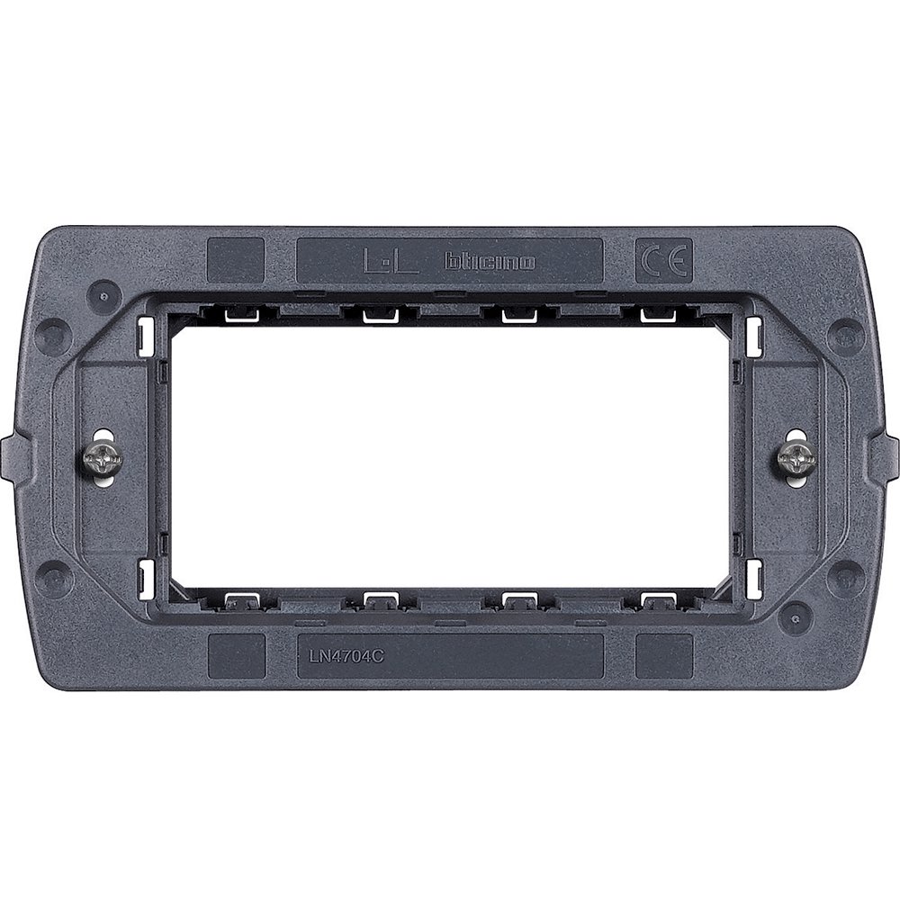 Suport BTicino LN4704C pentru plăci AIR 4 module, fixare cu șuruburi, material termoplastic, montaj orizontal și vertical.