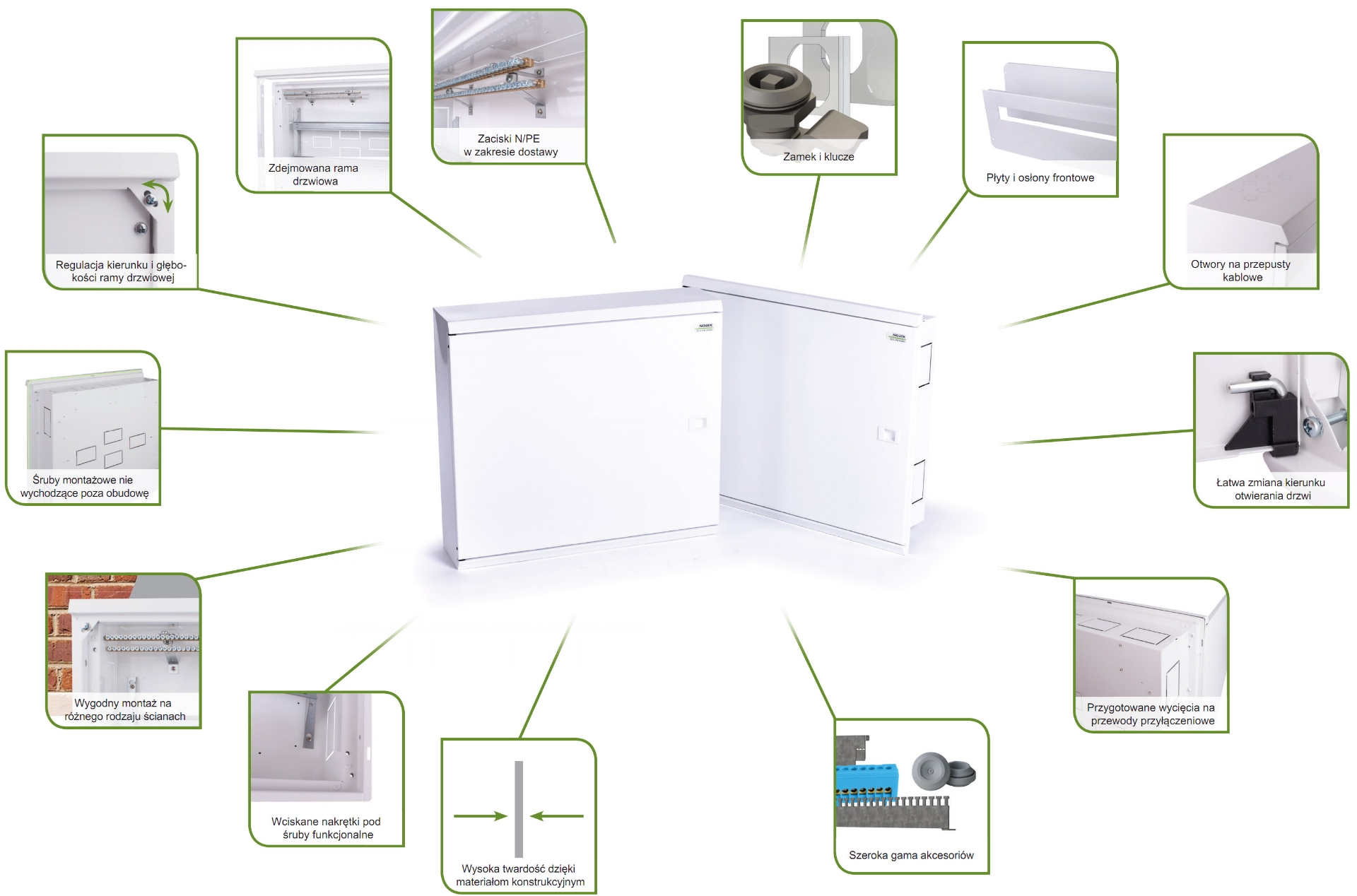 Tabloul metalic de distribuție EMFS4 96W este ideal pentru diverse aplicații comerciale și rezidențiale. Designul său plat și soluția tehnică permit montarea ușoară pe perete sau încastrată în pereți relativ înguşti, inclusiv cei din gips-carton. Rama reglabilă detașabilă previne deteriorarea în timpul montajului și compensează imperfecţiunile suprafeţei peretelui, permițând și o rotație ușoară. Poziţia ușii de deschidere poate fi schimbată cu ușurință datorită sistemului aplicat de balamale. Carcasa conţine orificii predecupate pentru conductoare sau presetupe de cabluri, facilitând o ajustare rapidă înainte de conectare. Toate variantele de cutii sunt echipate cu cadru de şine detașabil, iar întreaga cutie este acoperită cu plăci frontale din tablă. O particularitate importantă a cutiilor metalice EMF este varietatea de accesorii pentru personalizare, incluzând plăci de montaj, plăci de separaţie, plăci frontale, flanşe trecere cablu, şine fixare cablu, încuietoare şi altele.