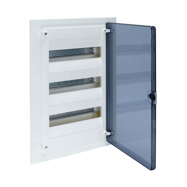 Tablou electric plastic PT 36 module, 3 siruri, IP40, cu geam transparent/fumuriu și șină DIN reglabilă.