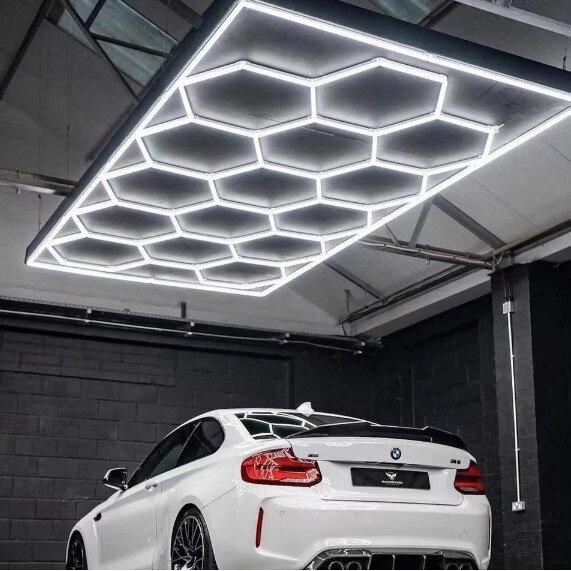 Set de 14 hexagoane LED, 650W, 6500K, ideal pentru ateliere auto, garaje și saloane.