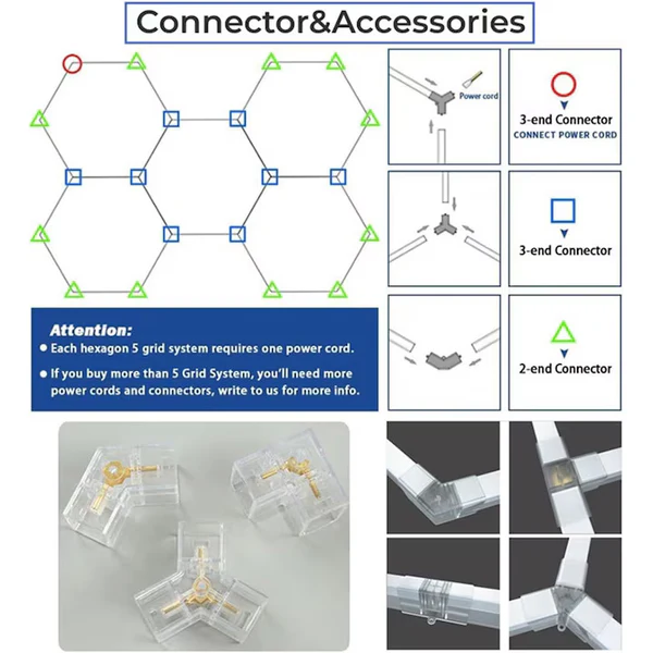 Pachetul include 24 de tuburi LED de 44 cm și conectorii necesari pentru asamblarea a 5 hexagoane. Cu o temperatură de culoare de 6000K și un flux luminos de 20000 lumeni, acest sistem acoperă suprafețe de până la 30-40 mp.