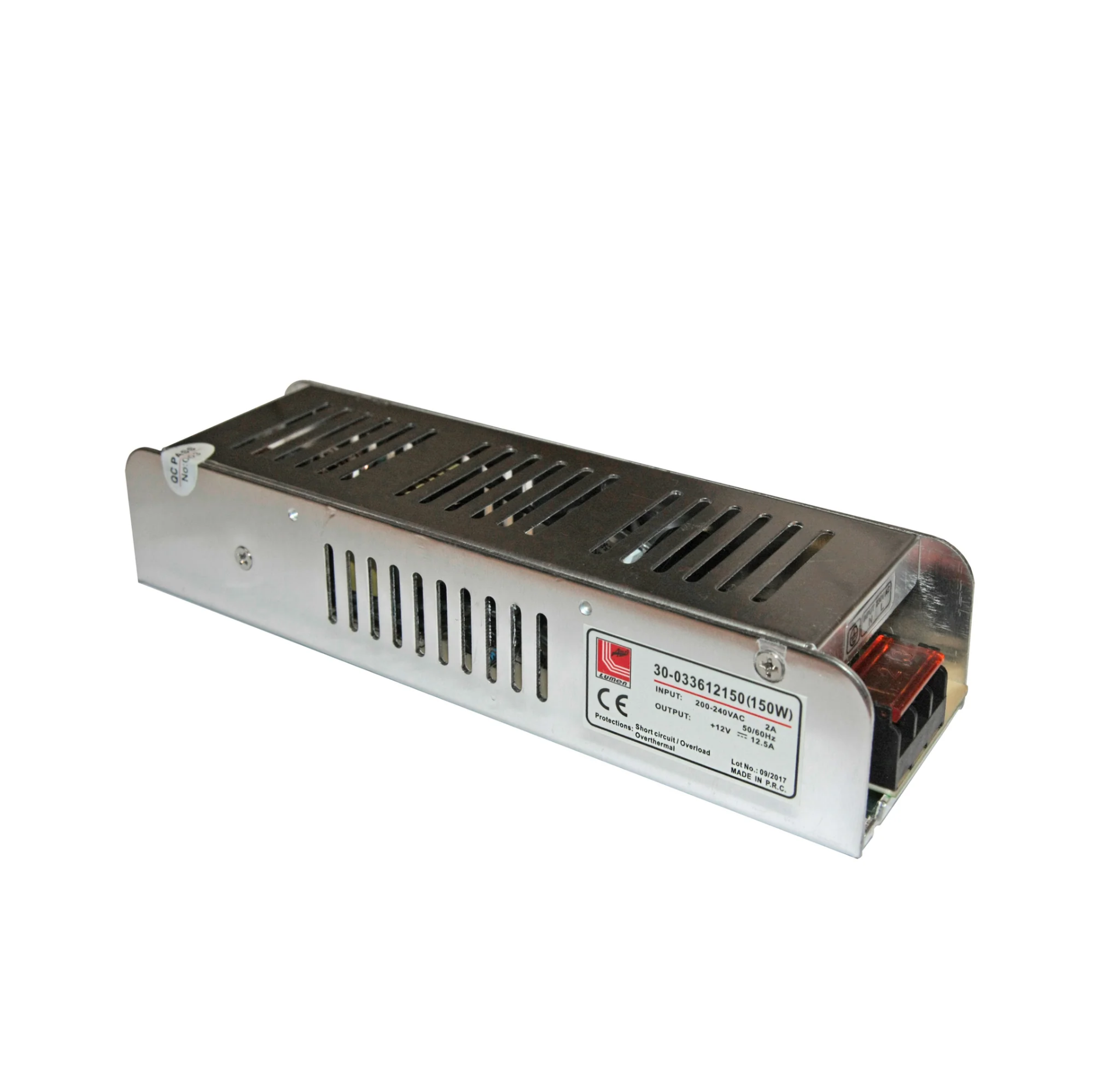 Transformator pentru LED 230V/12V 150W din aluminiu, ideal pentru alimentarea benzilor LED de 12V, cu carcasă metalică perforată pentru o răcire eficientă.