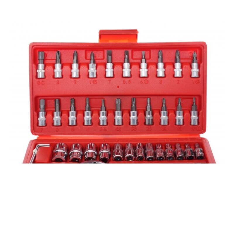 Trusa de scule Rebel cu 46 de piese din oțel crom-vanadiu, ideală pentru diverse lucrări de reparații și întreținere.